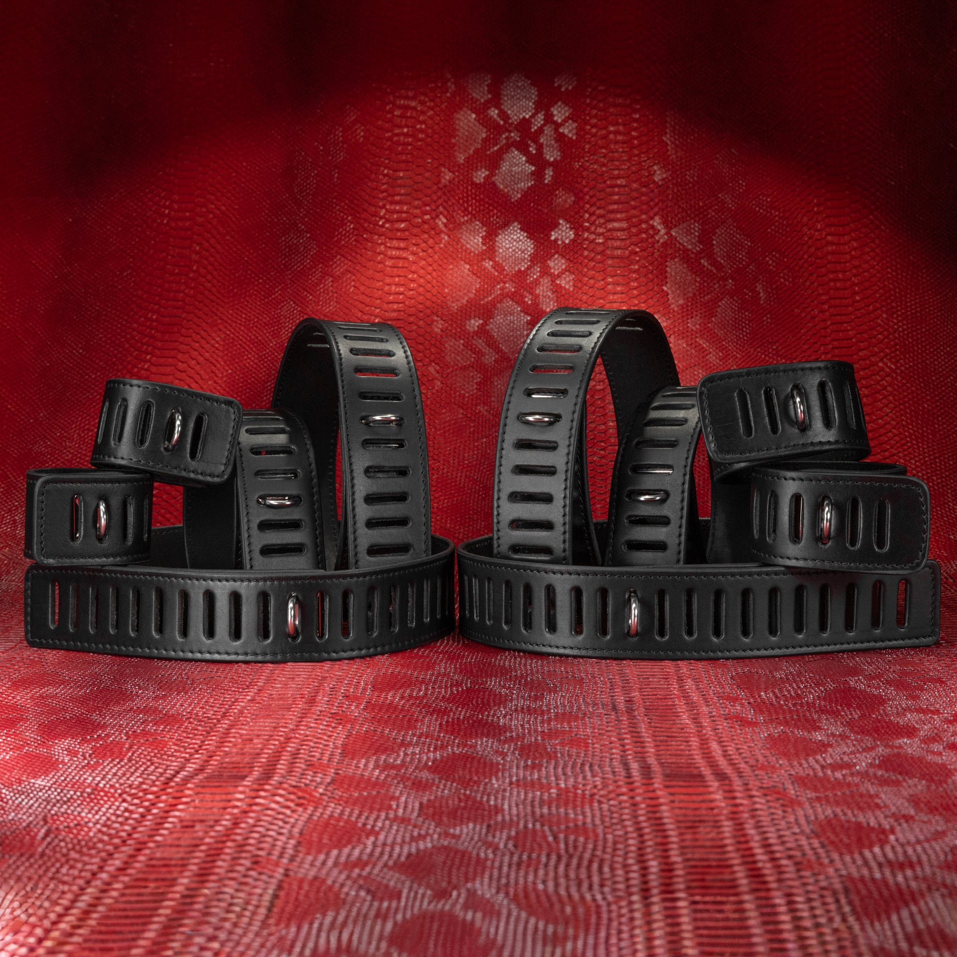 The Ten Piece Restraint Set is the full monte of leather restraints: simple, to the point & simply overwhelming. The extra 39" waist belts bring full immobility to this bondage equation.