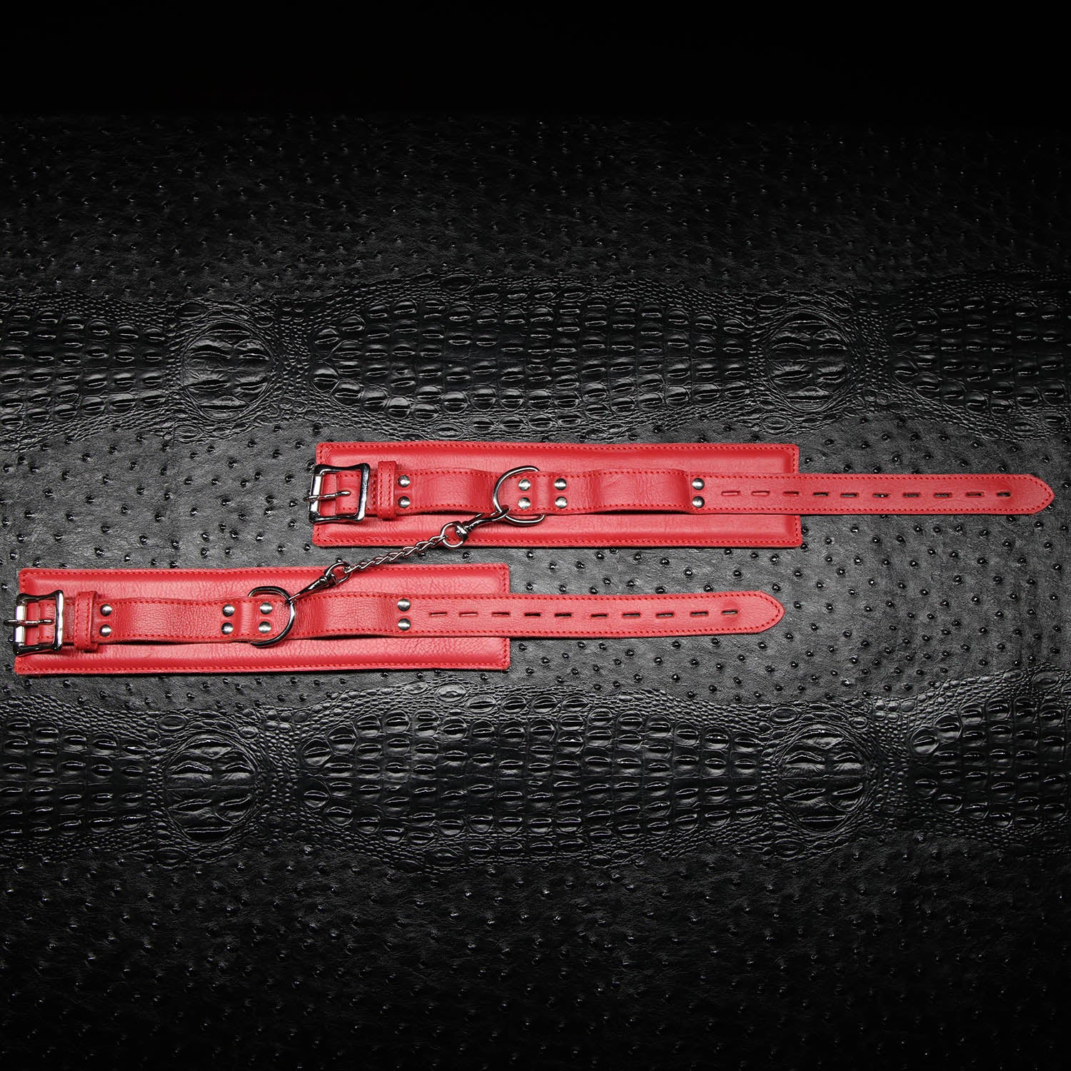 These devilishly stylish ankle cuffs are guaranteed to become your new favorite bondage accessory. Hook the cuffs together or separate them to get you or your partner into all the hottest and sexiest positions. They're made of 100% genuine leather and come in this season's hottest colors, Kink red and black.. The double-riveted D-rings are sturdy enough for all levels of play. These cuffs have a high-quality padded, suede inner lining for comfort and safety. The outer saddle strap can be adjusted to the desired tightness. Use them with the included double snap hooked chain or with your favorite bondage accessories like a waist belt, thigh cuffs, wrist cuffs, or leather collar.