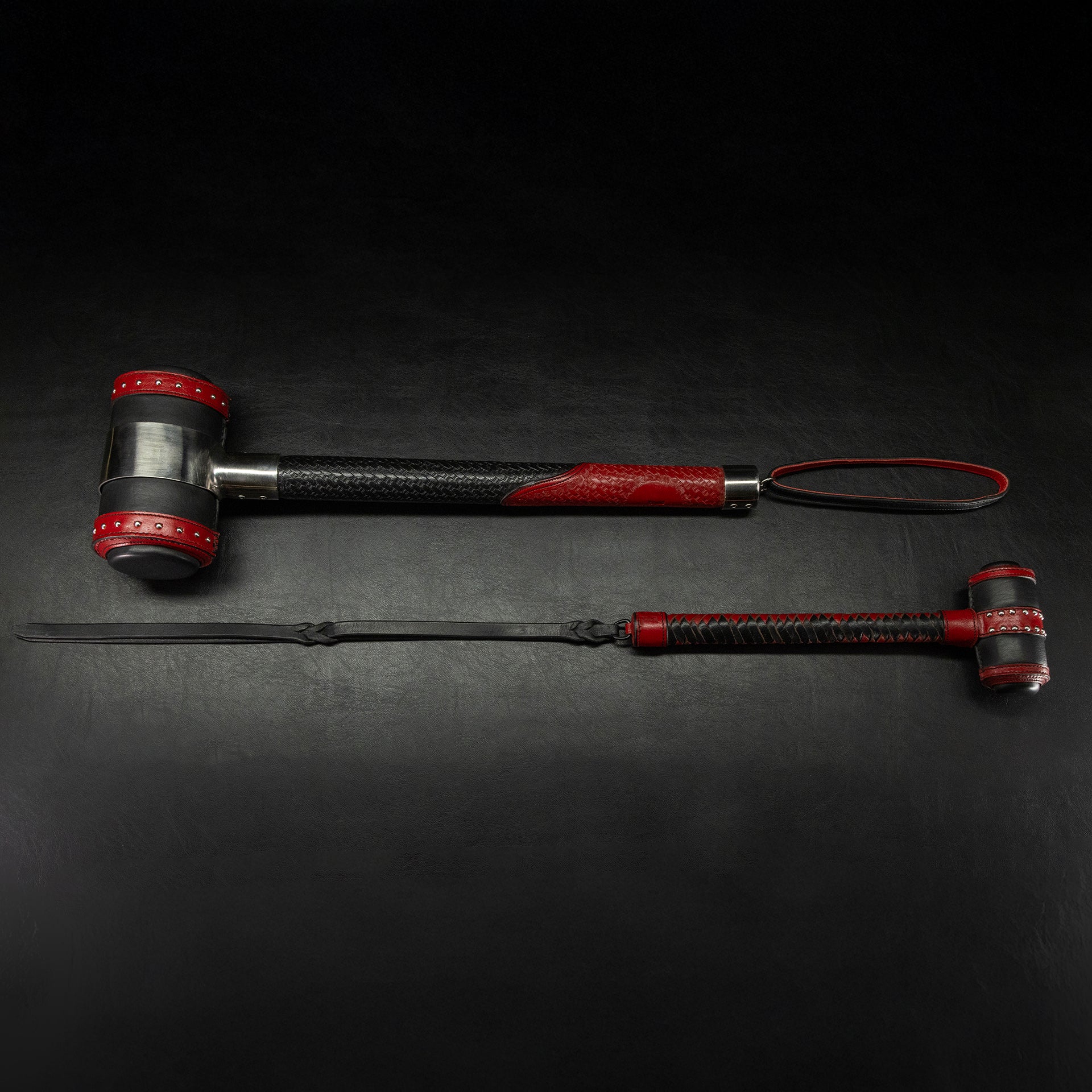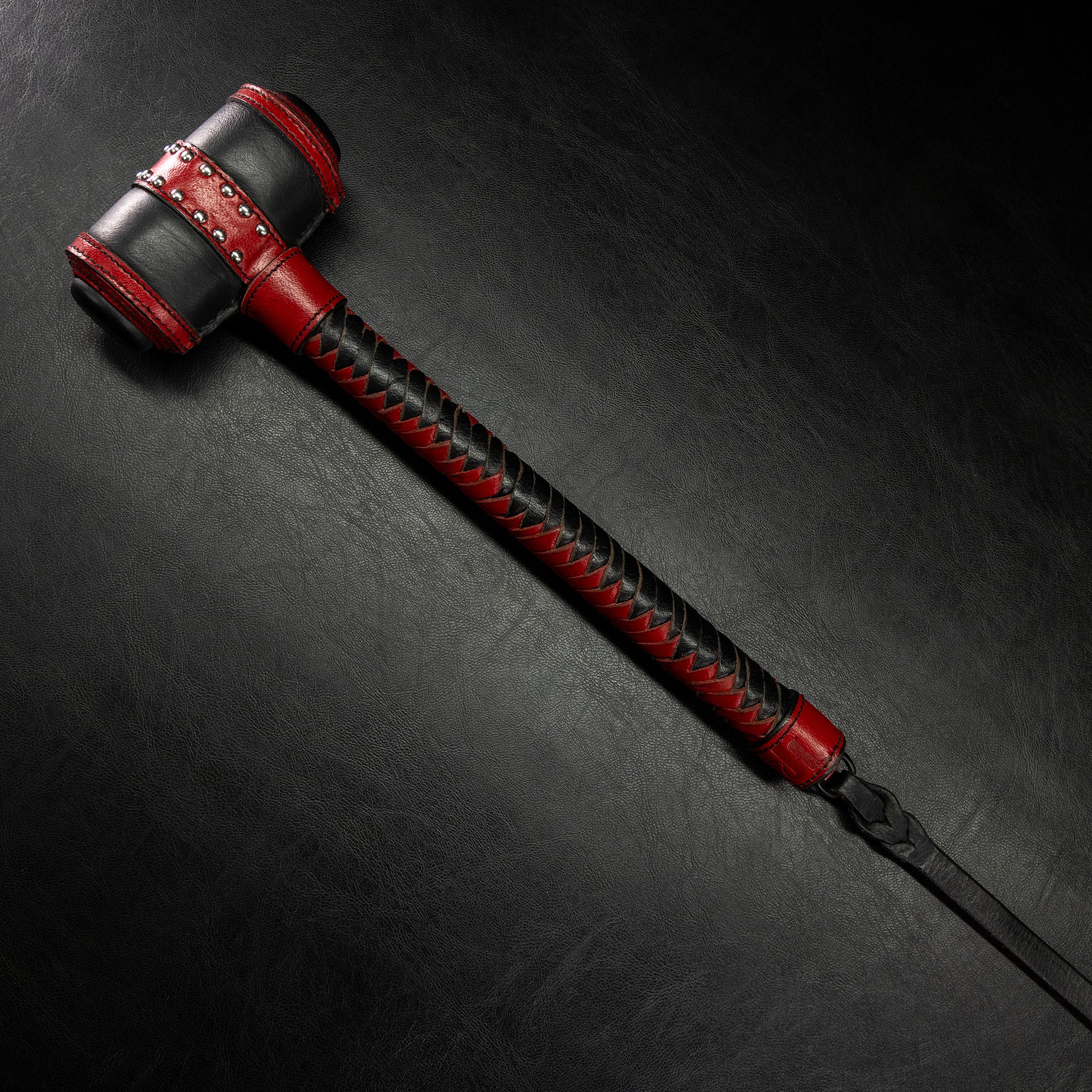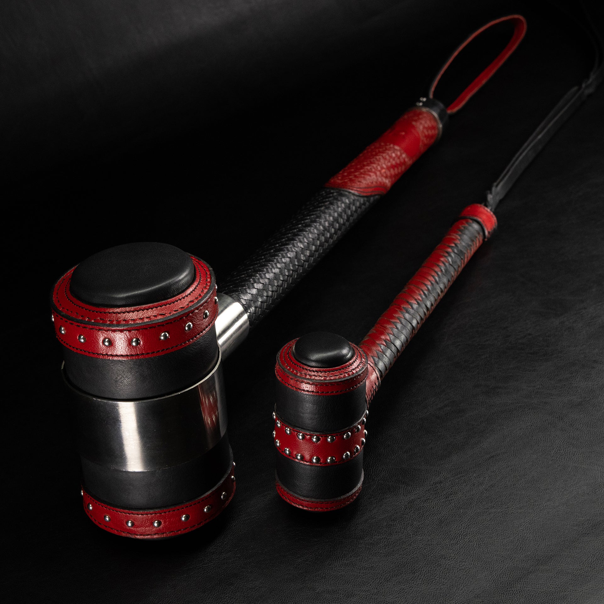 Our small hammer is perfect for all levels of experienced impact enthusiasts, measuring just 14 inches. The extra extended leather wrist strap is closed in the middle, leaving the tail pieces to be a great two tail whip. Our large hammer would proudly be the pièce de resistance of any dungeon. Measuring in at a whopping 23 inches this massive piece will have you feeling very powerful. Almost like a sexy croquet mallet, this weighty piece is the ultimate item in “thuddy” impact play.