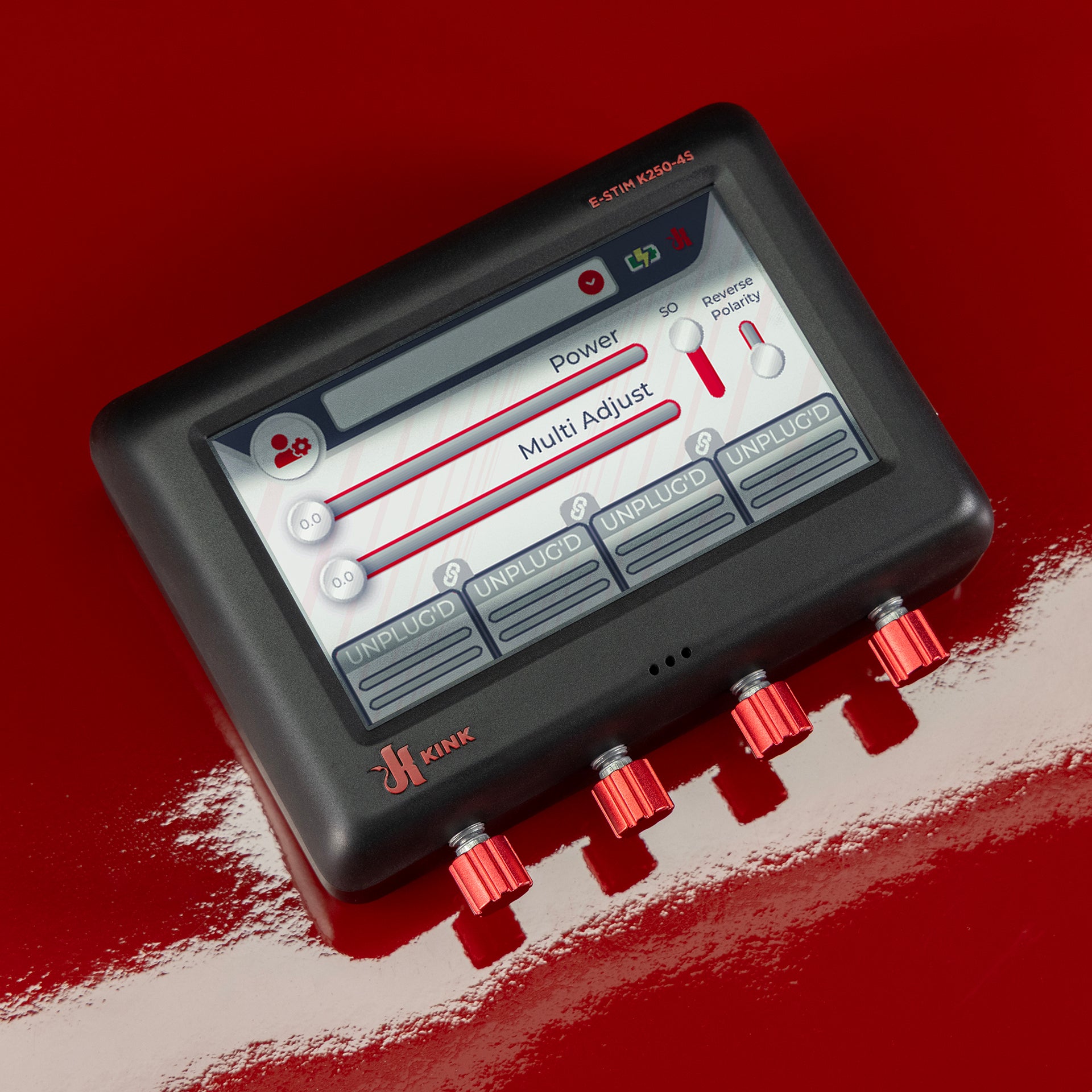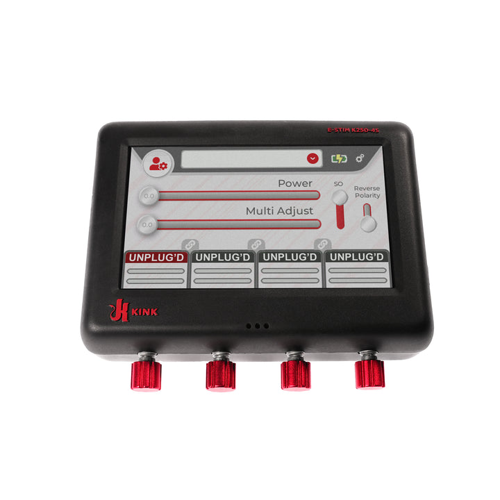 Kink's K250-4S has enough power to deliver a hefty charge to the largest e-stim toys. It is also very easy to control with the large touchscreen (4' x 2.25") that manages all the settings. The device also sports heavy duty manual knobs for those times when things need a little finesse.