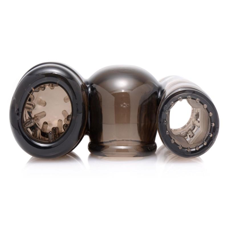 How long can you withstand this accessory that turns a massage wand into two tantalizing male sex toys? Perfect for orgasm denial or forced orgasm on your own or with a partner, this attachment slips easily over the head of a standard sized wand vibrator, providing two textured strokers that will thrum with the same incredible power as your massager. One stroker features a closed cup to target the head of the penis for pleasure, lined with soft tendrils to tickle and tease. The other stroker is open-ended to pleasure the entire shaft, lined with stimulating nubs for an unbearably intense massage with every thrust. Endure extreme vibrating ecstasy for as long as you can before exploding! Made of phthalate-free TPE, this pleasure tool can be used with both silicone and water-based lubricants.