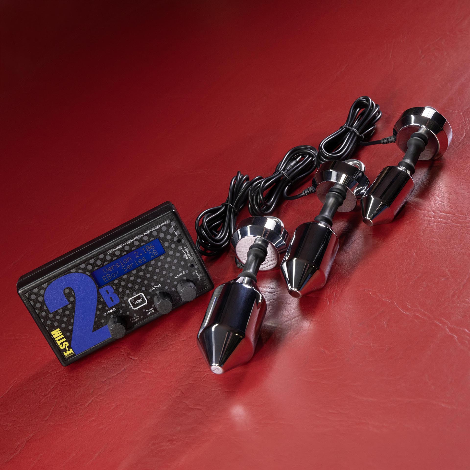 The E-Stim Systems 2B Controller is renowned as one of the world's most powerful and versatile digital e-stim units. It is designed and manufactured in the United Kingdom to the highest standards. With dual isolated channels, multiple adjustable programs, and audio-responsive functionality via a built-in microphone or stereo input, the 2B offers a depth of sensation that's hard to match. A soft-start rotary control and backlit LCD display make it intuitive for beginners while giving advanced users the precision they demand. Flexible power options — battery or mains-powered — mean you're never tethered to one location.