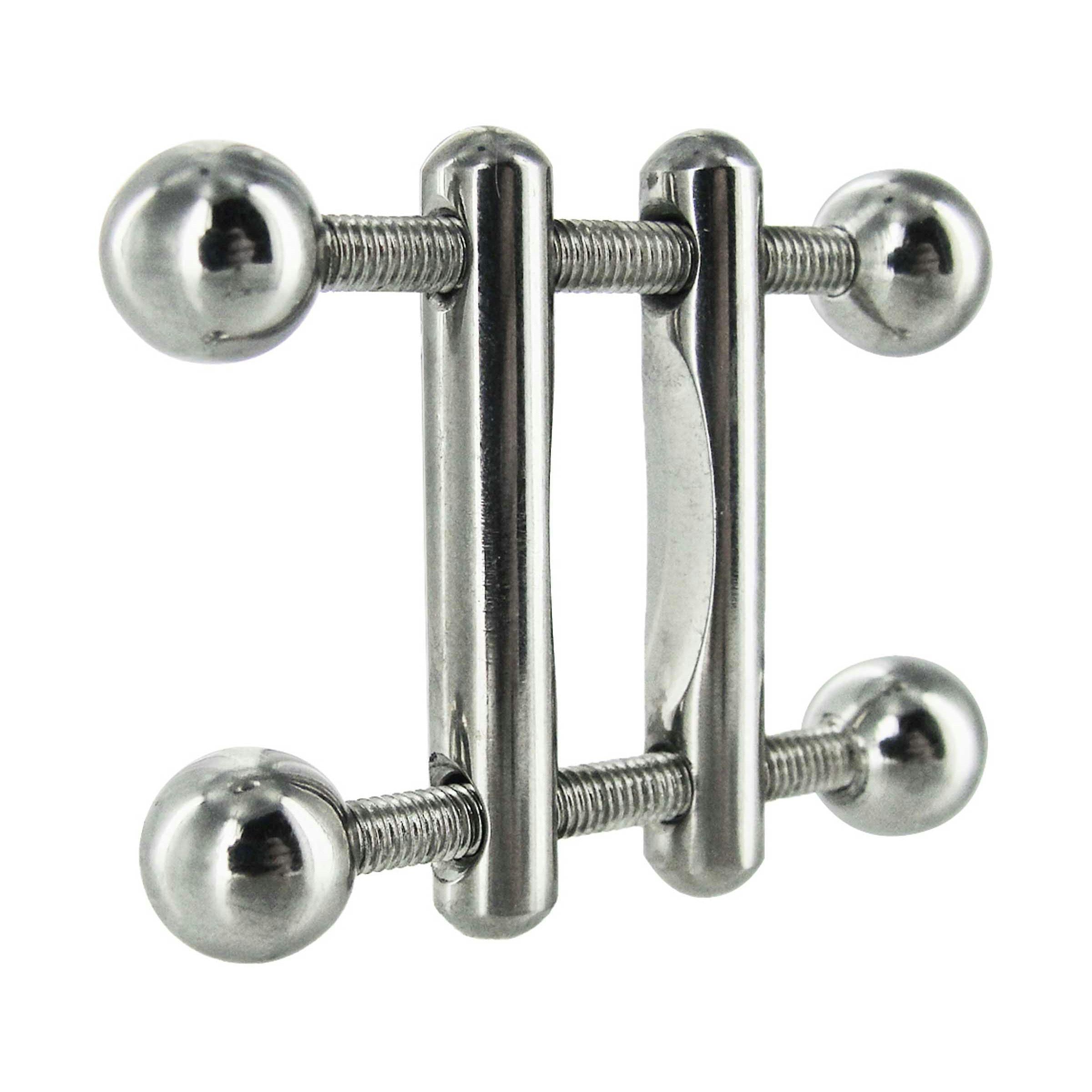 Enjoy some sensual nipple torment with the Twin Screws Nipple Press. Fit the cool, metal crossbars over their nipple and begin to tighten the screws. As you twist the screws tighter and tighter, the two metal bars get closer and closer together, trapping the nipple between them. The bars close completely, giving you a full range of adjustability that puts the level of pain or pleasure you can inflict on your partner entirely in your hands.