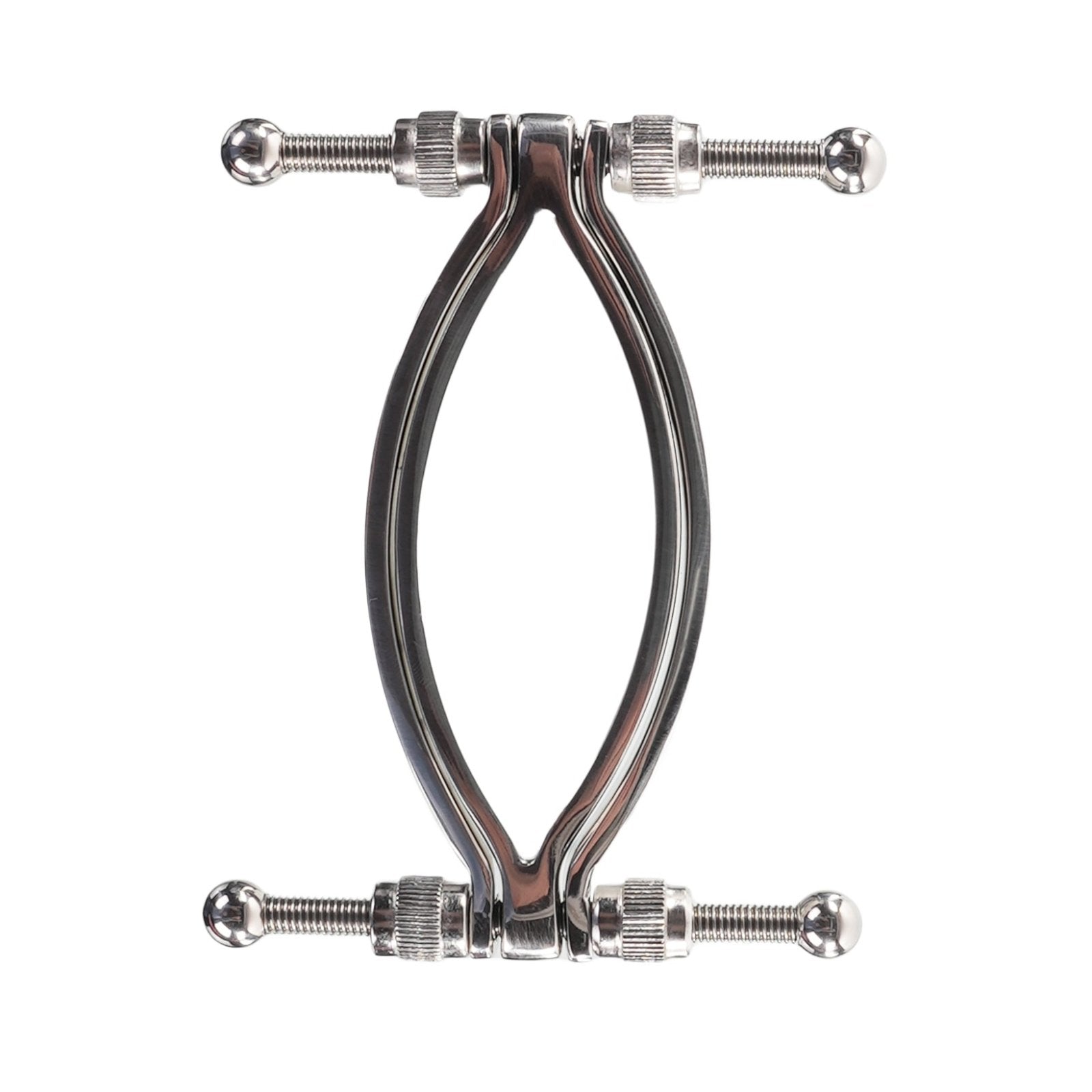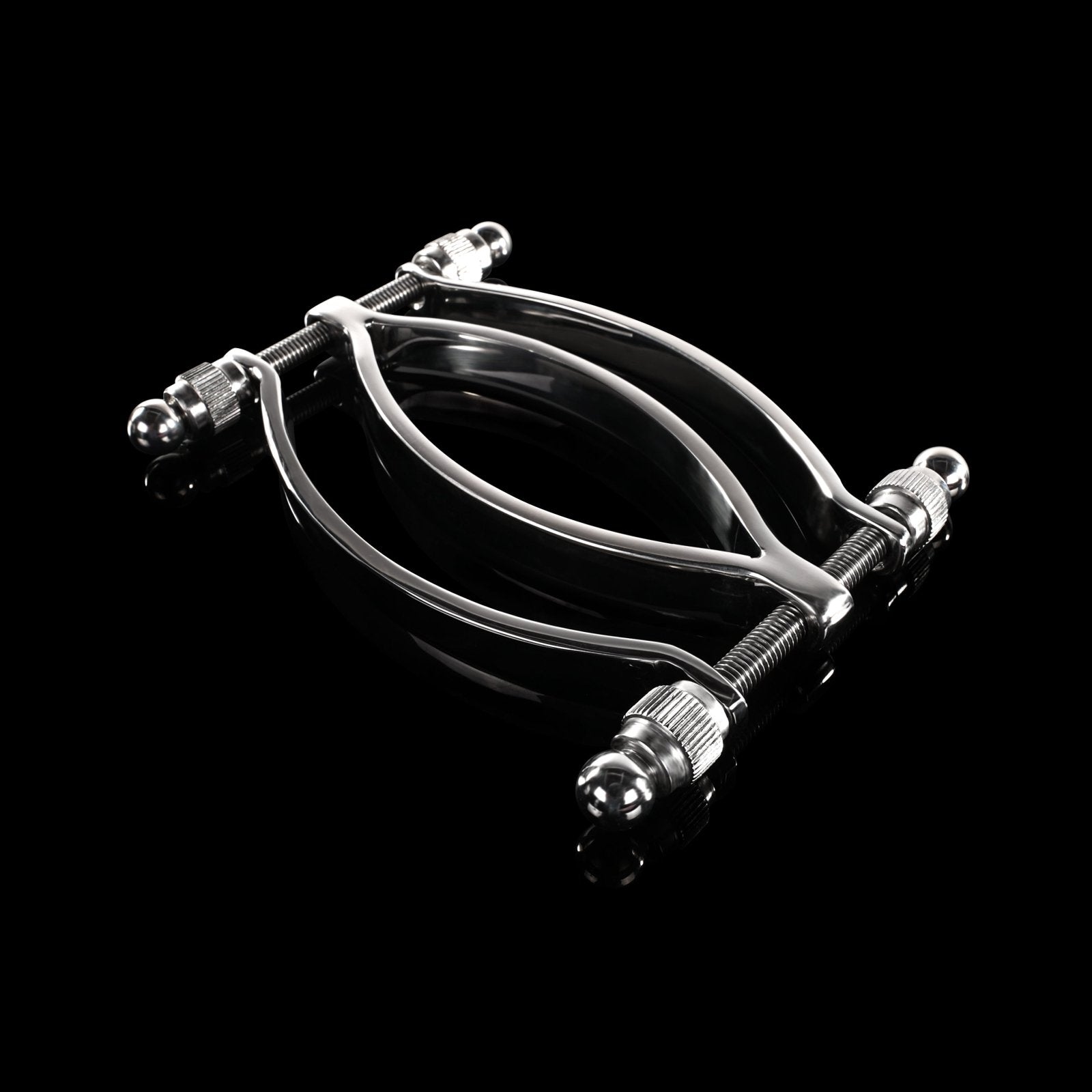 Expose and restrain the most intimate parts with this labia lock. Easily adjust the top and bottom screws on both sides. This labia lock is made of body-safe, high-quality stainless steel. Have some sexy fun spreading open and locking the labia in place. The smooth balls at the end of the threaded bars provide added comfort.