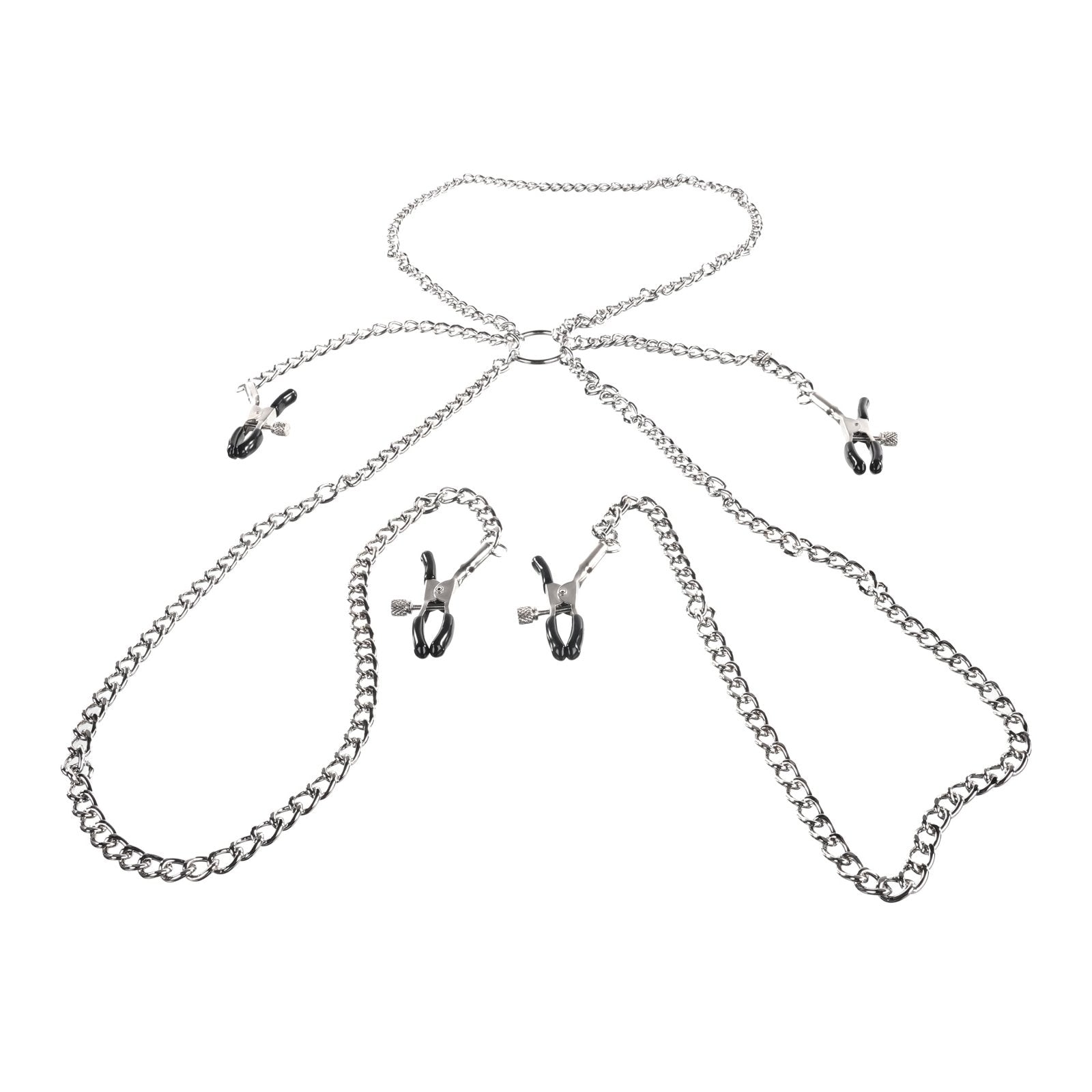 This eye-catching, industrial-style clamp system looks amazing draped from the nipples and labia. It provides constant, hands-free stimulation so you can reserve your hands for other sexy activities. These easily adjusted clamps are great for all levels of play. Just tighten or loosen the side screw for a mild to more intense sensation. The coated ends prevent unwanted pinching. Admire and adorn your plaything with this hot and elegant, industrial-style accessory!