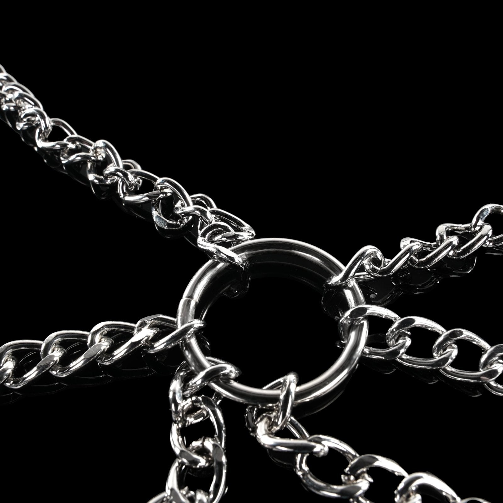 Dimensions: Collar chain is 26" (66cm); nipple chains are 6" (15cm) long; labia chains are 23" (58cm); center O-ring is 1" (2.5cm); clamps are 2"(5cm) long