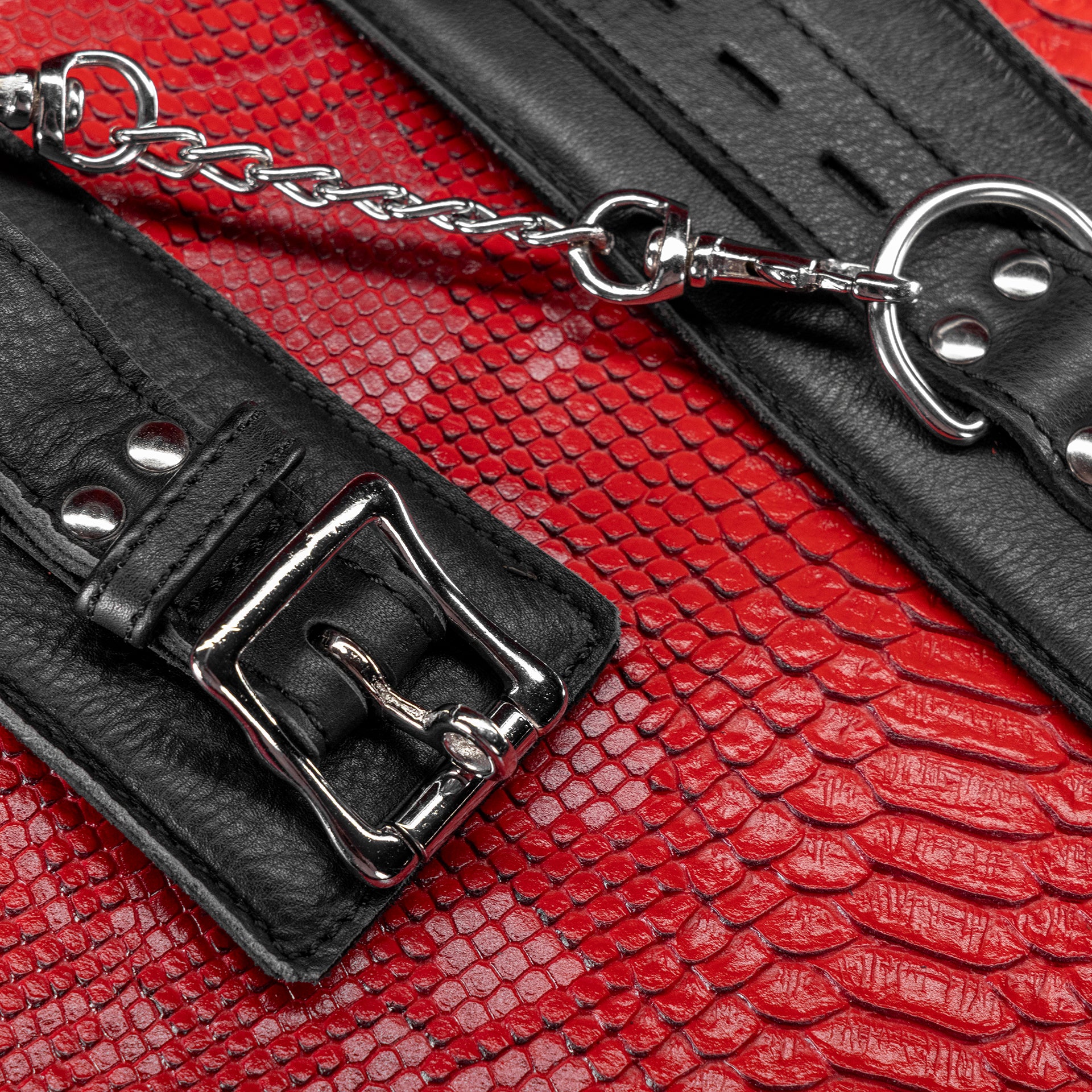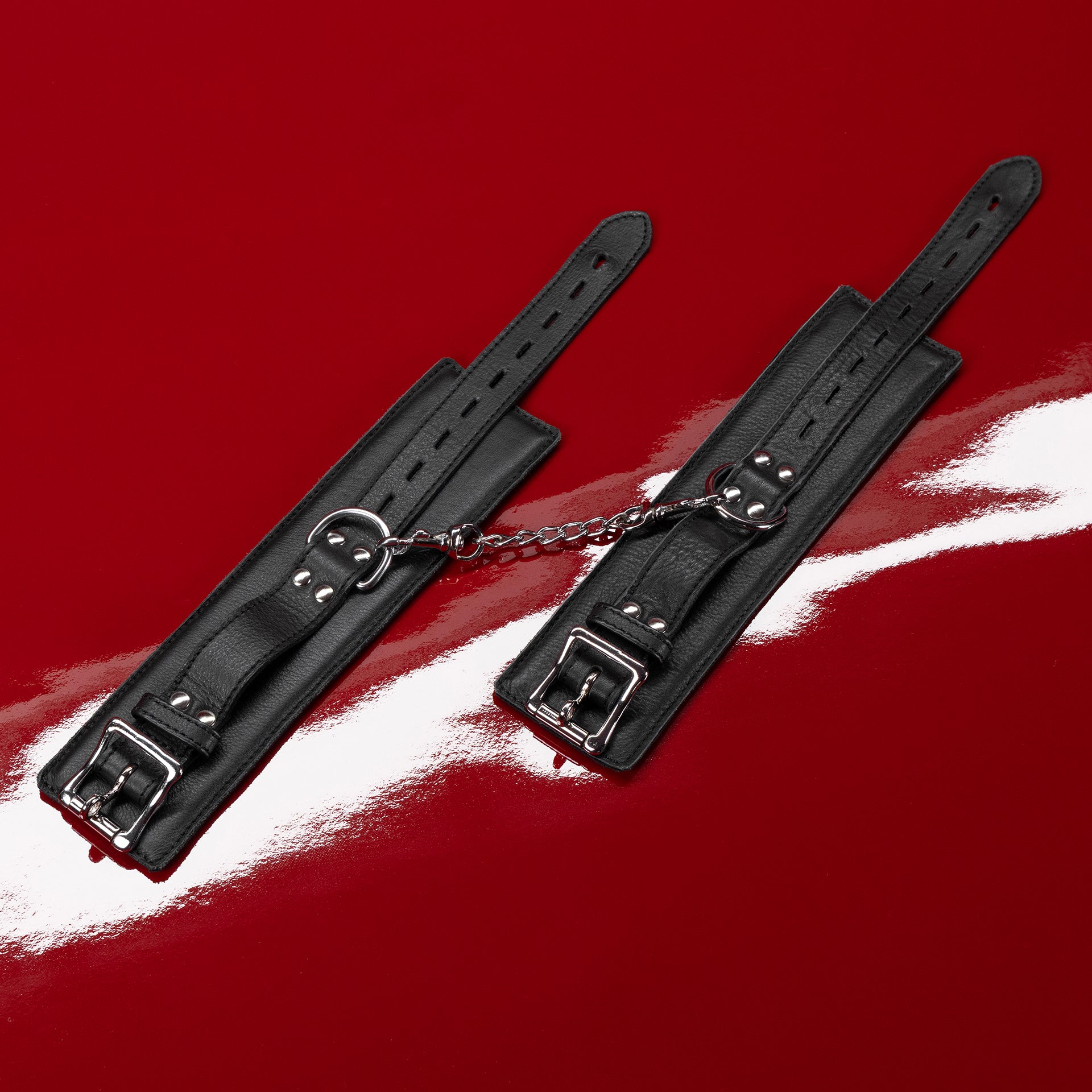This pair of beautifully crafted, Kink leather wrist cuffs are a must for your collection. They're made of 100% genuine leather. They feature double riveted D-rings and a sturdy, outer saddle strap that can be adjusted to the desired tightness. You or your partner will love the feeling of these high-quality padded cuffs, especially the soft suede inner lining. Use them with the included double snap hooked chain, or attach them to your favorite bondage accessories like a waist belt, thigh cuffs, or ankle cuffs.